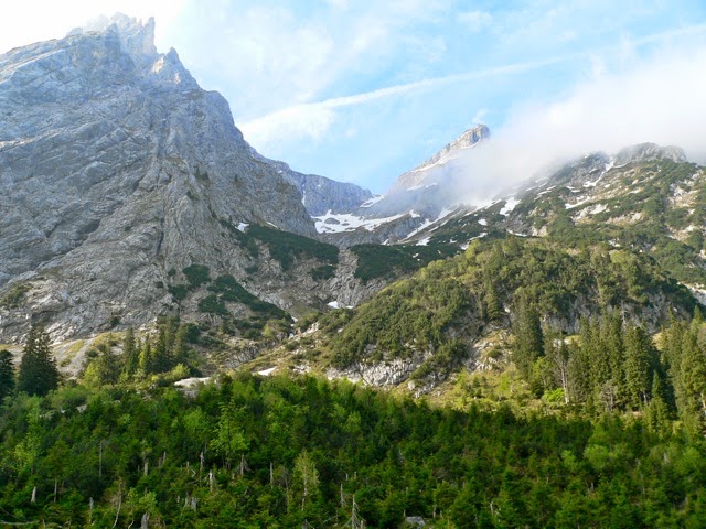 Unser Ziel: die Otto-Mayr-Hütte (1530 m) in den Tannheimer Bergen. Unser Gipfel: die Große Schlicke (2059 m). Der Weg dahin führt durchs Raintal, das hie und da einen kleinen Geocache versteckt hält und so ein wenig Abwechslung in die Forstweg-Monotonie bringt. Der erste hieß passenderweise „Frauensee-Kurve“ und war schnell geloggt. Der zweite behielt sein Geheimnis für sich. Die Musauer Alm, mir schon von einer Mountainbiketour vor vier Jahren bekannt, liegt hier sehr idyllisch im Tal vor Köllenspitze, Gimpel und Rote Flüh. Doch das Wetter lud nicht ein. Stattdessen nahmen wir Kurs auf die Wolkendecke über uns, denn irgendwo dahinter ließ sich die Große Schlicke vermuten. Und wenn bis dahin noch fleißig geratscht wurde (um an dieser Stelle endlich einmal ein Mädchen-Klischee zu bedienen), so wurde es spätestens hier stiller, weil der Steig deutlich steiler.