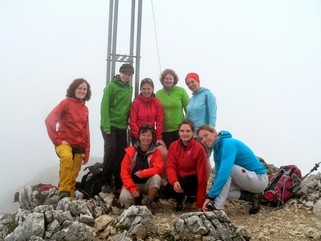 Noch ein Gruppenbild mit Panorama, bevor dieses komplett hinter Wolken verschwand, und 700 Höhenmeter über der Musauer Alm standen wir selbst wie in Watte gepackt am Gipfelkreuz. Dieses versprüht den Charme einer Mobilfunkantenne und die Sonne ließ sich trotz geballter positiv-weiblicher Energie am Gipfel nicht blicken. Aber dafür brachte unser Outfit eine Menge Farbe ins triste Grau.