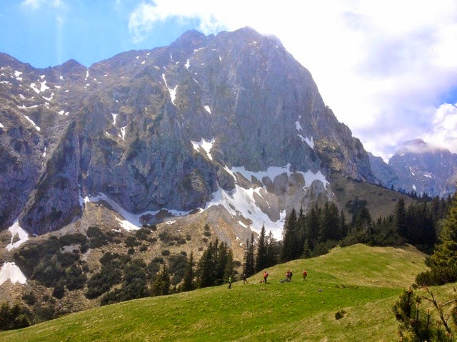 Nach einem heißen Gegenanstieg wurde es auf der sattgrünen Hahlealpe vor der mächtigen Wand der Gehrenspitze noch einmal richtig gemütlich – ein typischer Platz, der zum Rasten und Dösen einlädt. Und zu Gruppenfotos!