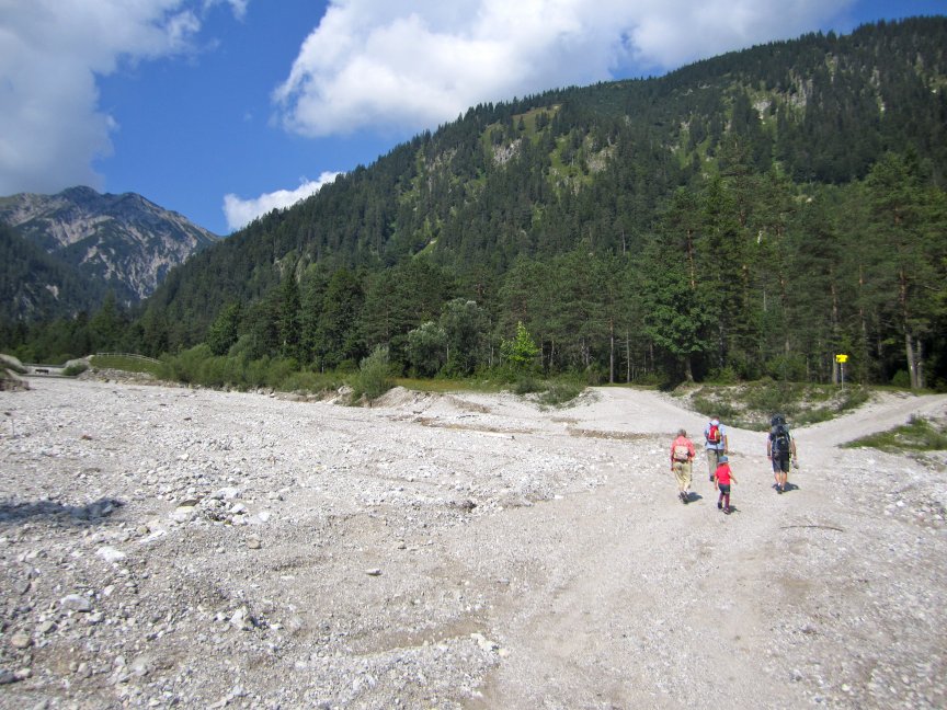 Weiter geht’s nun bald auf Schotterweg durch dieses herrliche Tal, das von den steil aufragenden Felswänden unterhalb des Falzthurnjochs, der Bettlerkarspitze und der Schaufelspitze gesäumt wird und am Ende den Blick auf Sonnjoch und Lamsenspitze freigibt. Beim ersten Weidezaun hält man sich – anders als wir – auf dem dort rechts abzweigenden Weg, der bald das Flussbett kurz quert und einige hundert Meter vor der Gramaialm wieder auf die Fahrstraße mündet. Wir nahmen nämlich den Wanderweg geradeaus über die Weide, was kein Problem gewesen wäre, hätten wir danach nicht die Fahrräder und den Anhänger einige hundert Meter mühevoll durch das lose Geröll eines großen Flussbettes schieben müssen. Helene fand die Vorstellung, durch ein leeres Flussbett zu stapfen alles andere als reizvoll (Rätsel: „In welchem Bett kann man nicht schlafen?“) und gab mir danach auch deutlich zu verstehen, dass sie das nicht wieder machen möchte (es sollte anders kommen…)