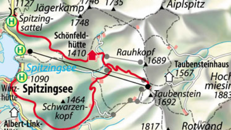 Das Spitzingsee-Gebiet hat diverse hübsche Familientouren zu bieten, vor allem aber auch eine herrlich urige Gondel, die Taubensteinbahn. Um eine kleine Wanderung mit dieser ausklingen zu lassen, muss man also am besten erst einmal bis hoch zur Bergstation (1613 m) kommen. Dorthin führt zum Beispiel der Weg über die Schönfeldhütte, eine hübsch gelegene Alpenvereinshütte der Sektion München/Oberland auf 1410 Metern.