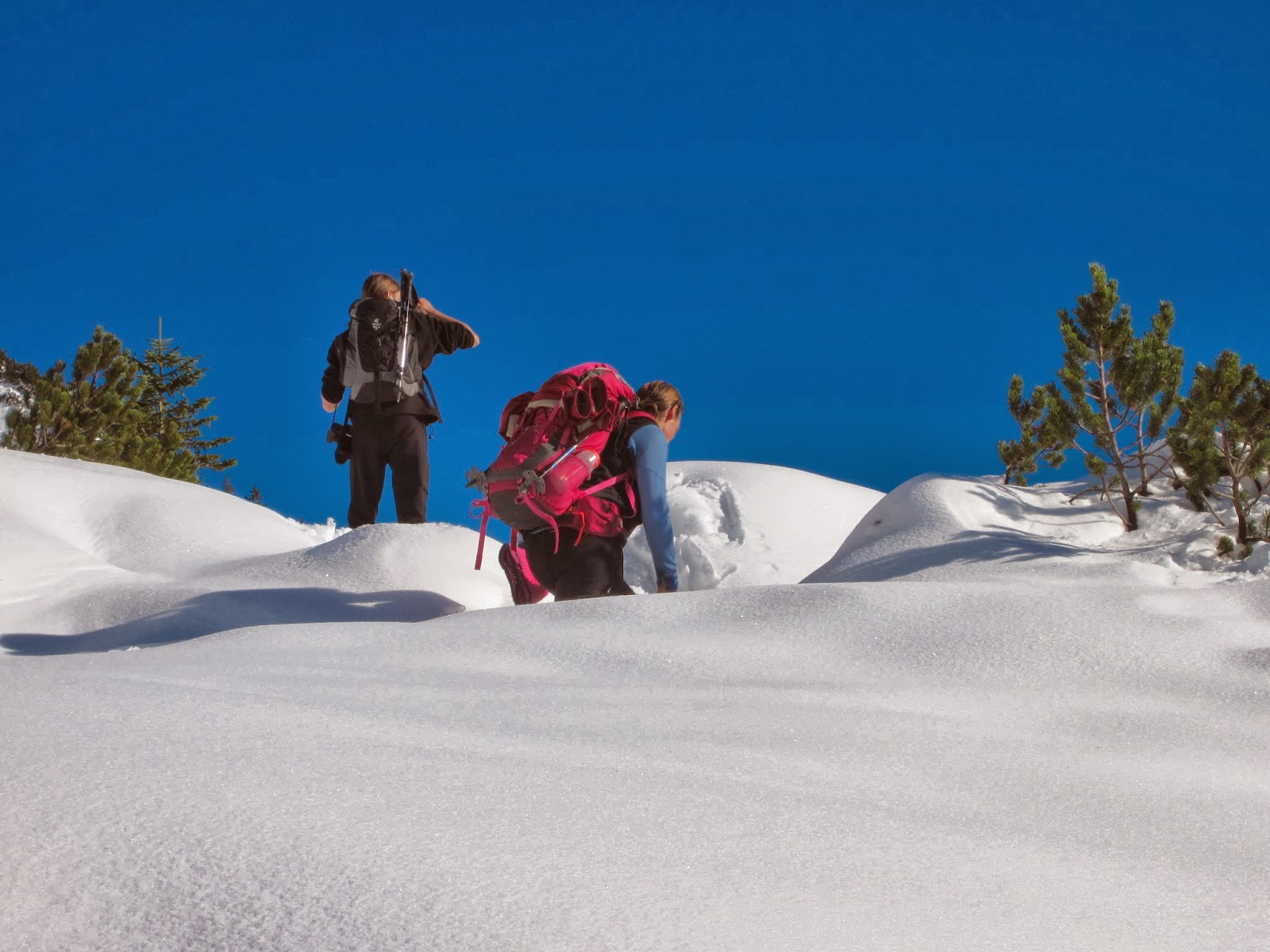 Wir starteten in Farchant beim Naturlehrpfad. Ein Steig führte uns von dort gut ausgeschildert steil durch den Herbstwald und Schneereste hinauf zum Forstweg, der dann direkt zur Esterbergalm führt. Hier rasteten wir zwar erst auf 1200 Metern, aber schon mitten in bezaubernder Winterlandschaft. Von der sonnigen Terrasse aus sahen wir erste Skitourengeher zum Wank aufsteigen. Irgendwie unwirklich erschien mir diese Mischung aus goldenem Herbst und frühlingshaftem Tauwetter vor winterlicher Tiefschnee-Kulisse. Hinter der Esterbergalm stieg der Weg weiter langsam bergan und mit jedem Höhenmeter nahm das Skitouren-Feeling zu, spätestens als wir aus dem Wald heraustraten und nur noch einer schmalen Spur im Schnee folgten.