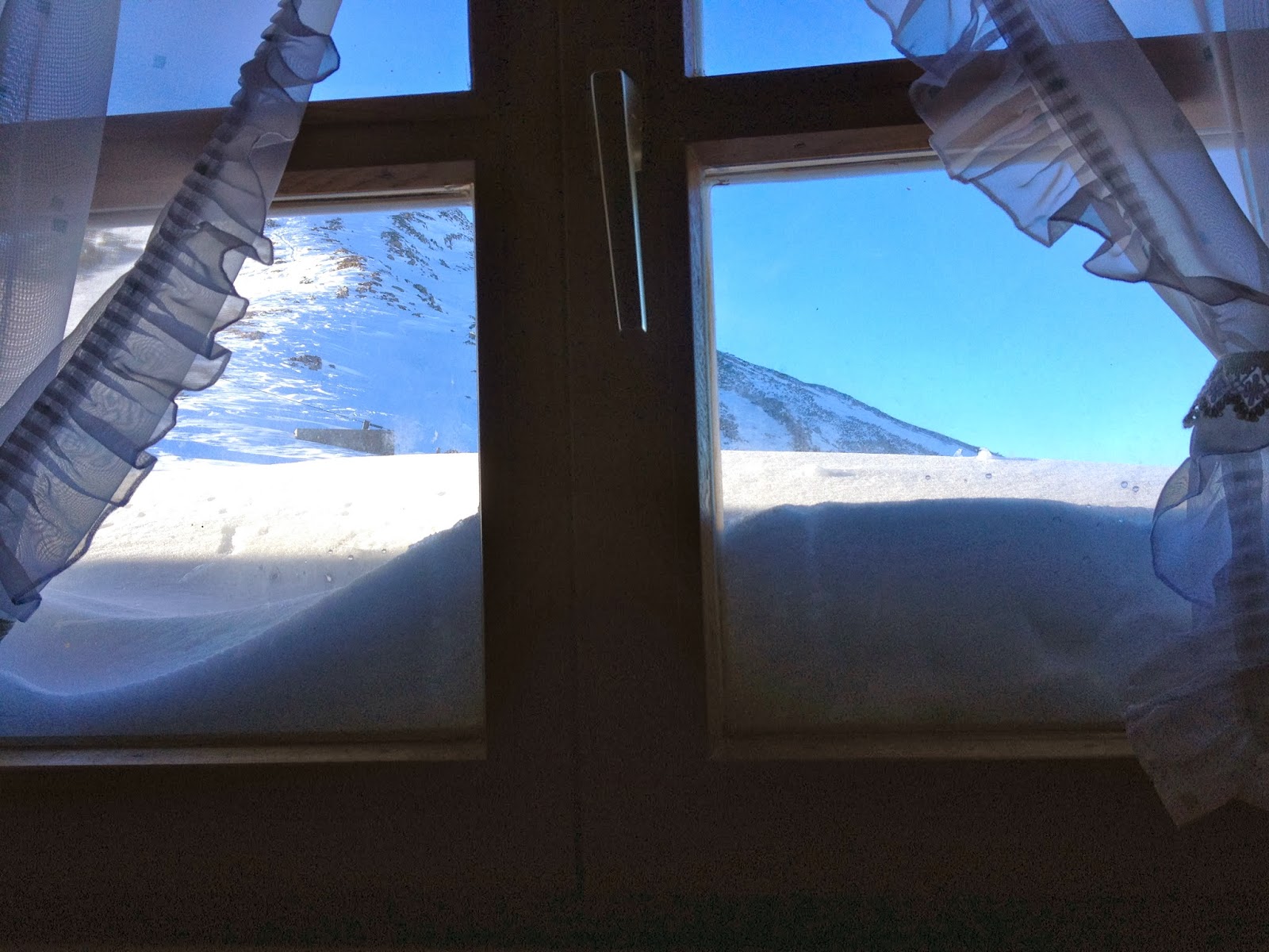 Schon fast oben, trieb uns unangenehmer Rückenwind direkt in die Hütte. Glücksfall Nr. 3: Wir hatten die freie Auswahl an Einzelzimmern – wann erlebt man schon mal soetwas! Ein Blick in die Koje: Heidi-Romantik. Klein, gemütlich, Rüschengardinen vorm Fenster und Schnee dahinter. Ich konnte mein Glück kaum fassen und war froh, dass auch die anderen nicht mehr auf den Gipfel wollten.
